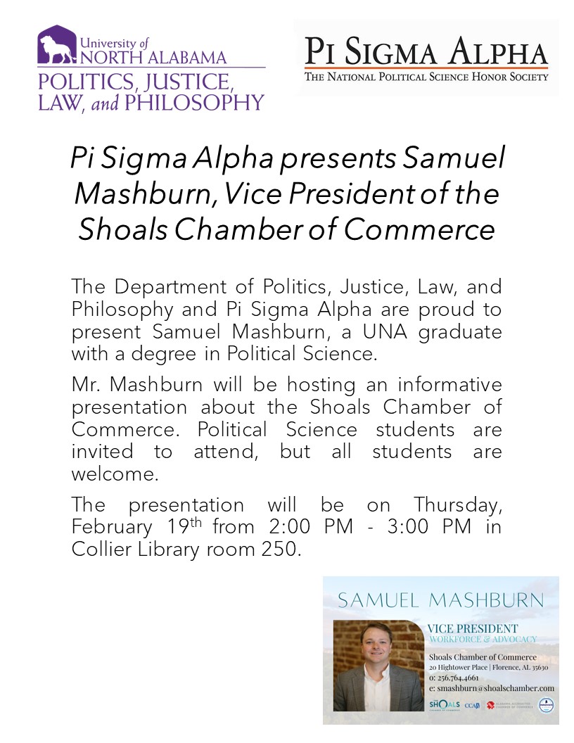 The Department of Politics, Justice, Law, and Philosophy and Pi Sigma Alpha are proud to present Samuel Mashburn, a UNA graduate with a degree in Political Science.