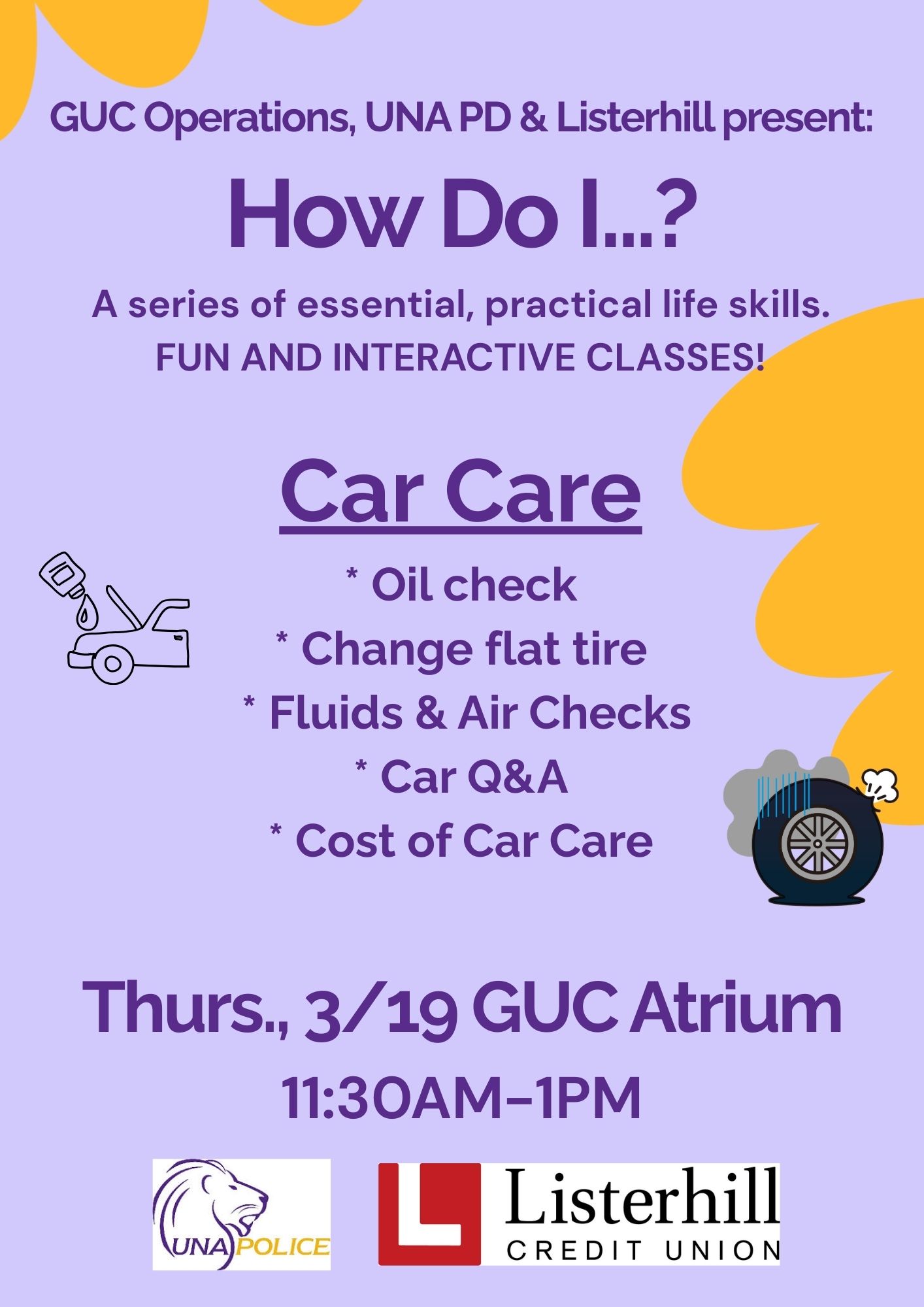 GUC Operations, UNA PD, and Listerhill present “How Do I…Care for my Car?”. March 19, 11:30am-1pm in the GUC Atrium. We will review basics of car maintenance & costs that may come with it. This includes checking oil & other fluids, checking & maintaining tire pressure, and how to change a tire if needed. Stop […]