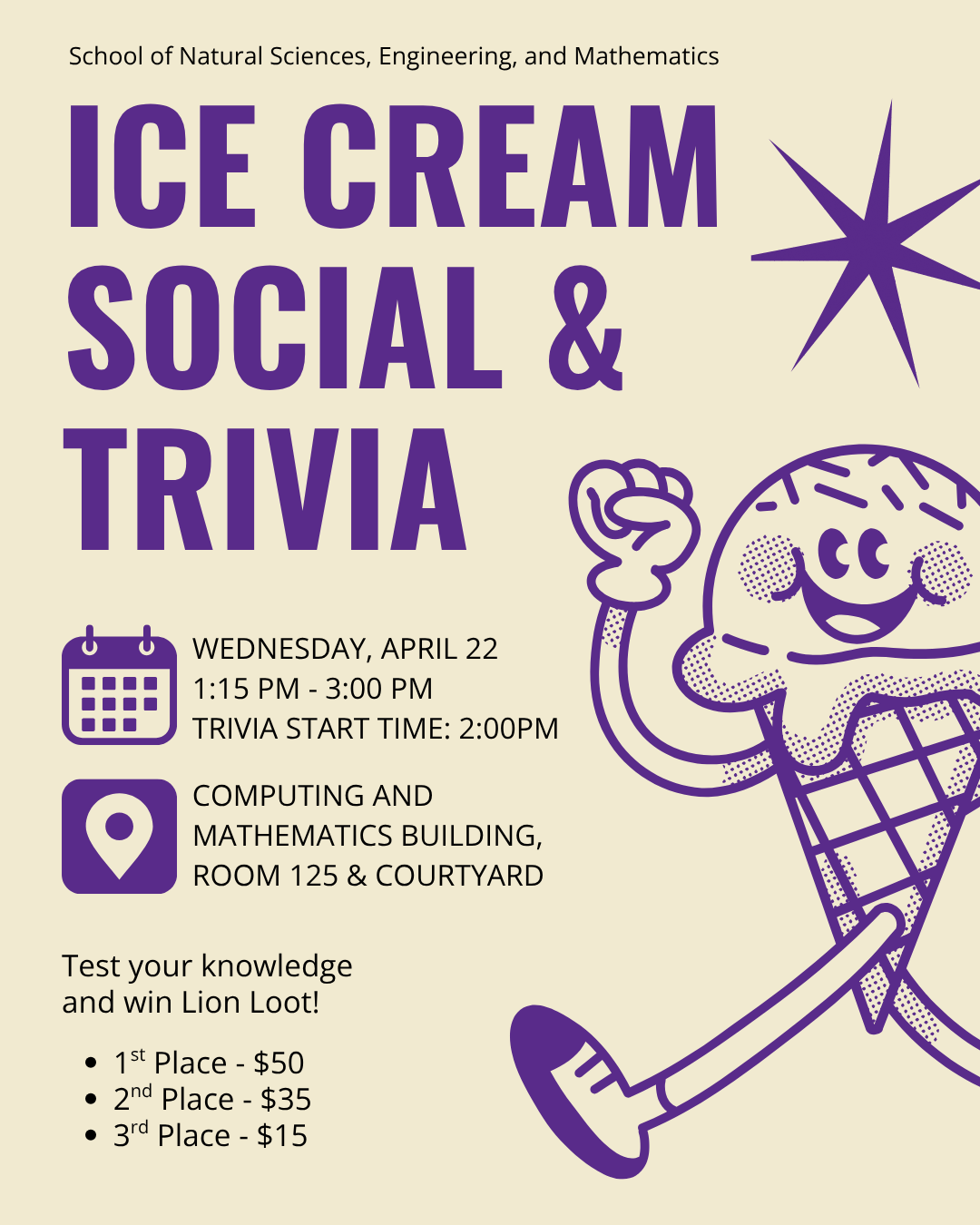 The School of Natural Sciences, Engineering, and Mathematics invites you to an ice cream social and trivia event. Put your knowledge to the test for a chance to win Lion Loot—$50 for first place, $35 for second, and $15 for third! Trivia will begin at 2:00pm.