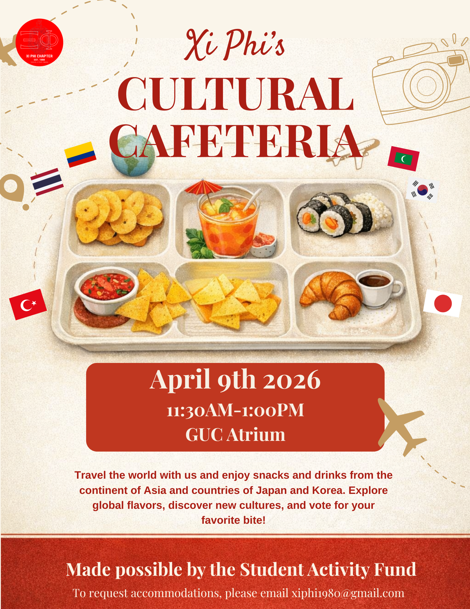 Xi Phi’s CULTURAL- CAFETERIA April 9th 2026 11:30AM-1:00PM GUC Atrium Travel the world with us and enjoy snacks and drinks from the continent of Asia and countries of Japan and Korea. Explore global flavors, discover new cultures, and vote for your favorite bite! Made possible by the Student Activity Fund To request accommodations, please email […]