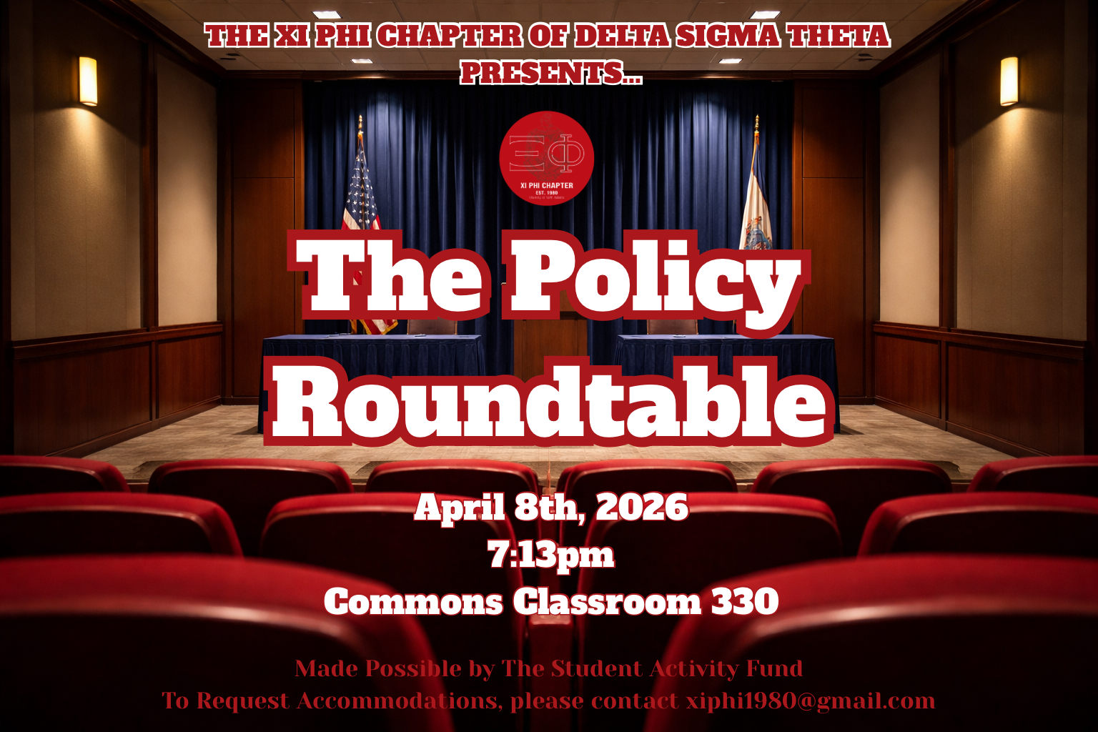 The Policy Roundtable April 8th, 2026 7:13pm Commons Classroom 330 Olive Garden will be served! Made Possible by The Student Activity Fund To Request Accommodations, please contact xiphi1980@gmail.com